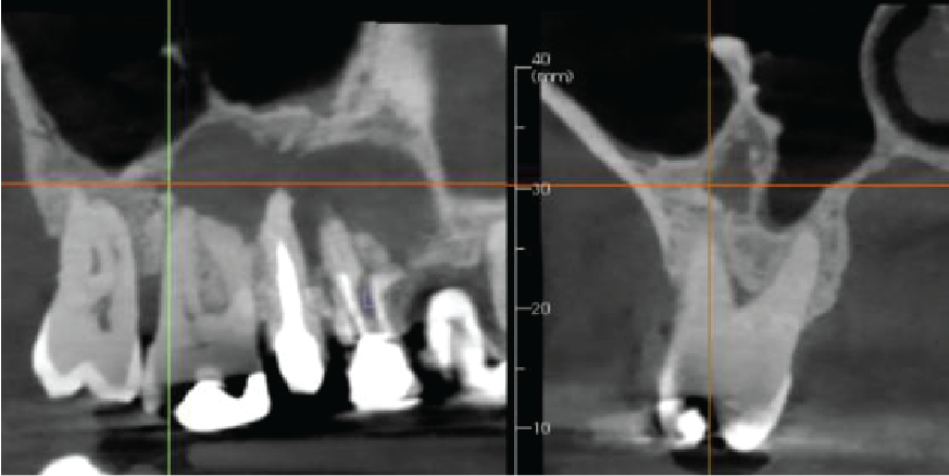 Cropped panoramic and cross section of the alveolar ridge in the UR4-6 region showing chronic apical infection and reactionary bone formation in the right maxillary sinus