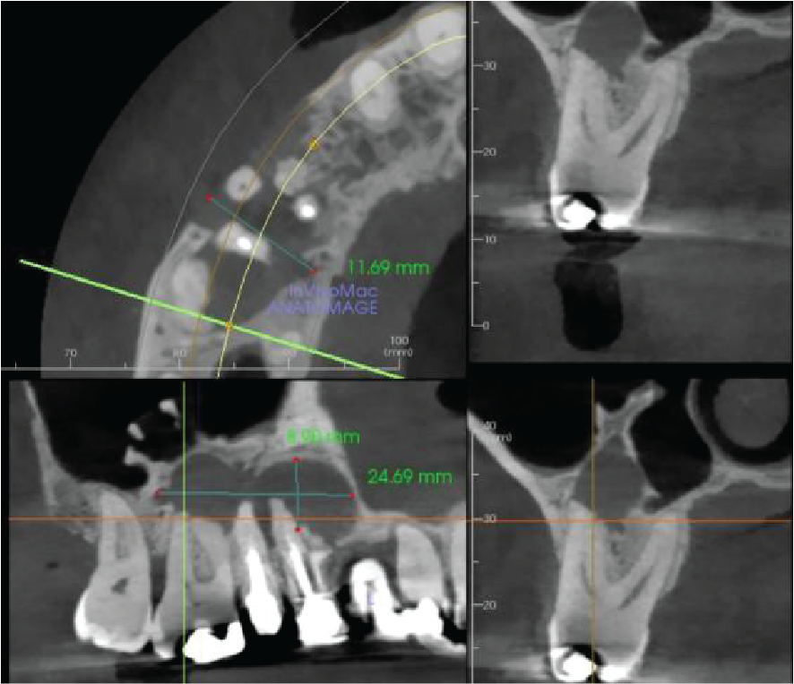 Cropped panoramic, axial and cross sections of the alveolar ridge UR4 6 region showing chronic apical infection