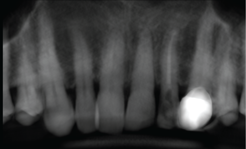 The UL1 is displaced buccally with no root fracture. The apical vessels are likely torn due to the displacement. No alveolar fracture is seen, although there is a little buccal cortical plate still attached to the root of UL1.