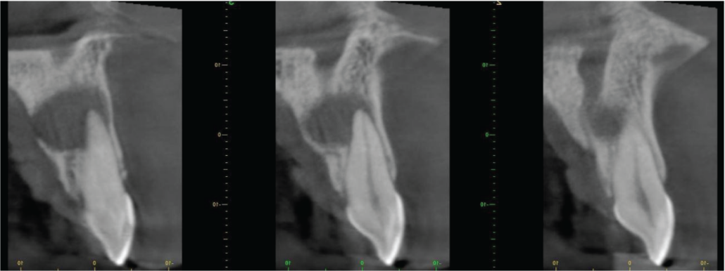 The lesion extends mesially to involve the UL1 root apex and reaches the nasopalatine canal. The upper margin of the lesion is clear of the nasal floor (image 3).