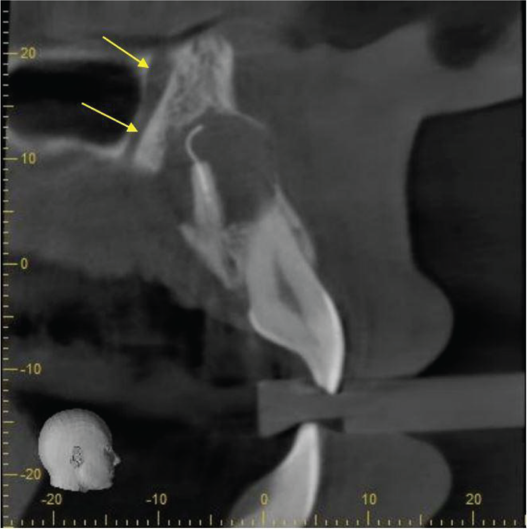 A large terminal branch of the anterior superior dentoalveolar canal runs about 2mm palatal to the lesion along the maxillary antral anterior wall (image 4).