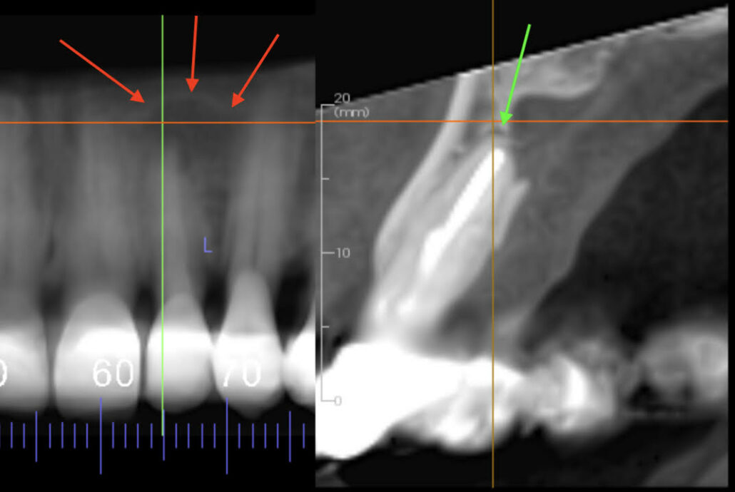 Two images, pre-extraction UL2. The left is a reconstructed cropped panoramic CBCT providing an image similar to a periapical intraoral radiograph. The red arrows show the outline of a well defined corticated unilocular apical radiolucency of UL2 ( 3 red arrows). However, the Right image is a cropped reconstructed sectional alveolar arch which shows UL2 apex has a 0.5 to 1.0 mm radiolucency (green arrow). The image also shows that the lamina dura is intact and NOT part of the large palatal concavity superior to the apex. The radiolucency is very small and probably from fibrous healing of apex but may also be granulation tissue from chronic apical periodontitis. At this stage with no symptoms the correct management would be to monitor this 6 months later with a periapical radiograph to see if there is any radiographic change.