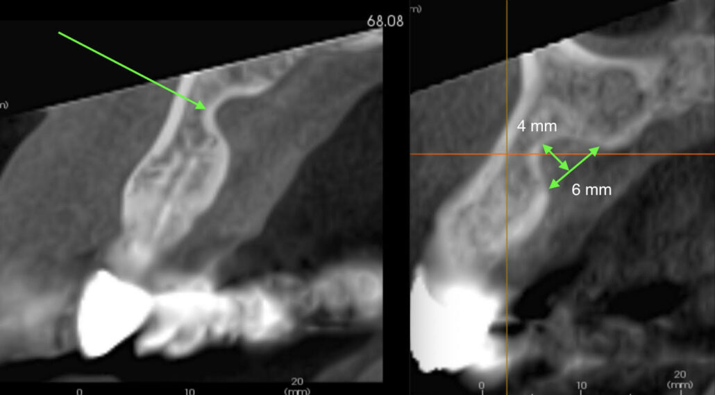 Two reconstructed CBCT cross sectional alveolar arch images made 6 months apart. The left is pre-extraction UL2 and the right 6 months later, post extraction UL2. Notice that both images have a well defined corticated concavity in the palatal side of the alveolar bone ridge approximately 4 mm wide by 6 mm deep. A detailed examination of cross sectional slices across the concavity confirmed that the bone concavity had not changed over a 6-month time interval.