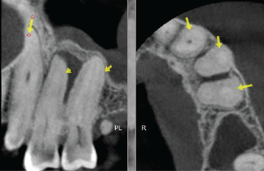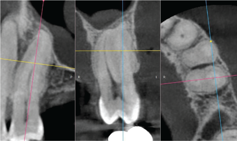 The UL5 has two roots which are practically fused due to hypercementosis. The apical half of the buccal root is not visible (possibly obliterated). Image 3