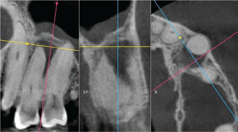 Between the UL4 and UL5 there is a well-defined radiolucency measuring approximately 6mm diameter. The lesion envelops the UL4 apex and abuts the apical half of the UL5 root. The genesis of the radiolucency is not of obvious endodontic origin since both teeth are unrestored and the location is not typically centred around the apex. If the teeth are vital, suggested tentative diagnosis are odontogenic cyst such as lateral periodontal cyst or fibro-osseous origin. Image 4