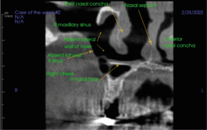 Initial examination of the scan volume with a coronal slice through the R cheek, maxillary sinus and nasal septum revealed 1) Absent R lateral wall of nose, 2) Absent R lateral wall of maxillary sinus.