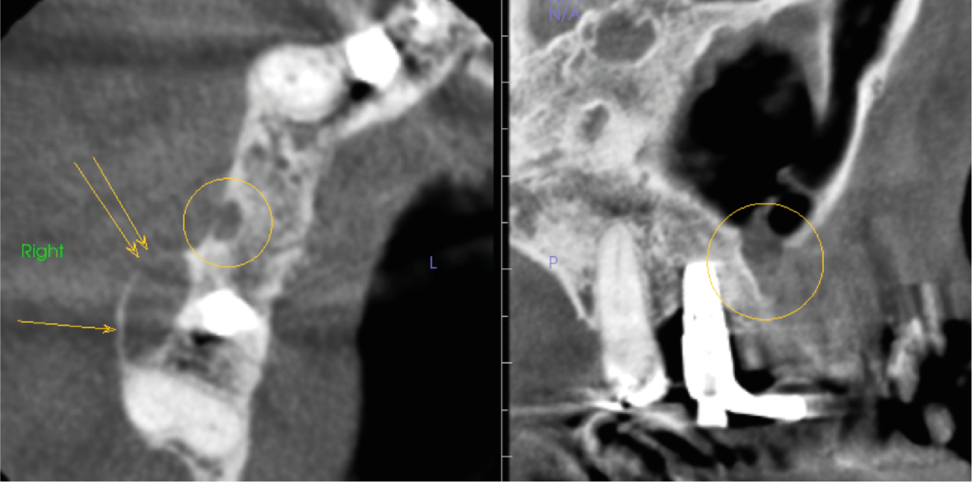 Figure 2. Right image is axial slice through UR alveolar bone ridge with circle in UR5 region and arrows UR6 region. Left image is sagittal slice UR7 to UL3 region