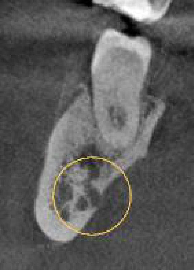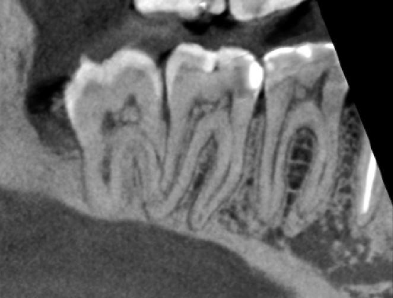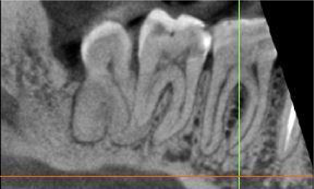 REASON FOR REFERRAL: LR6 has a history of pain and tenderness to biting for two years. The patient had symptoms which correlate to an irreversible pulpitis following the replacement of the restoration, which resolved with antibiotics. Clinically the tooth is not TTP, with no tenderness in the buccal sulcus and probing depths within normal limits. CBCT needed to check for any apical pathology before commencing root canal treatment.